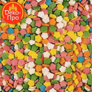 Состав: сахар, мука рисовая, масло пальмовое, носитель (Е1422), декстроза, загустители (Е415, Е466), эмульгаторы (лецитин соевый, Е432), глазирователь (шеллак), красители (Е102, Е110, Е120, Е133), ароматизатор "Ванилин", антиокислители (аскорбиновая кислота, Е306).